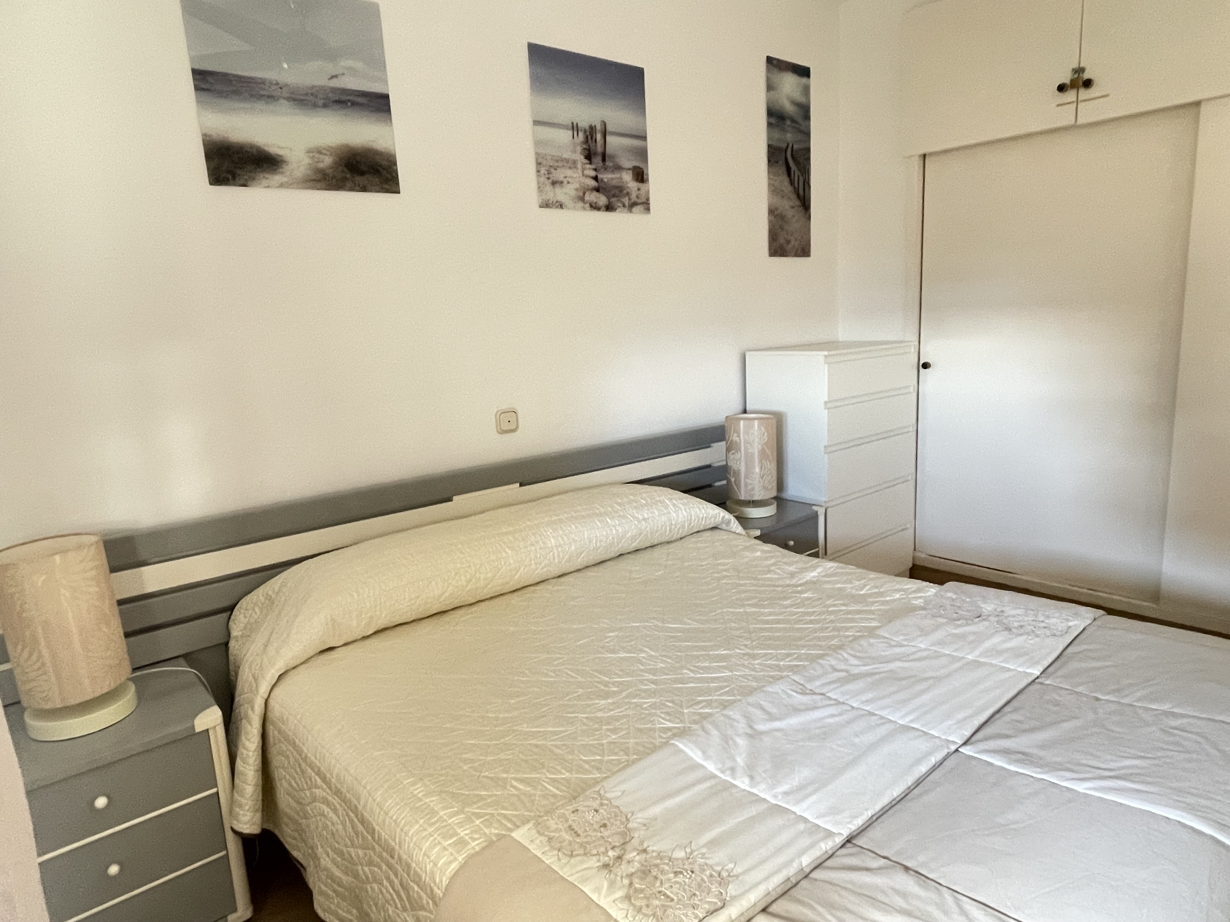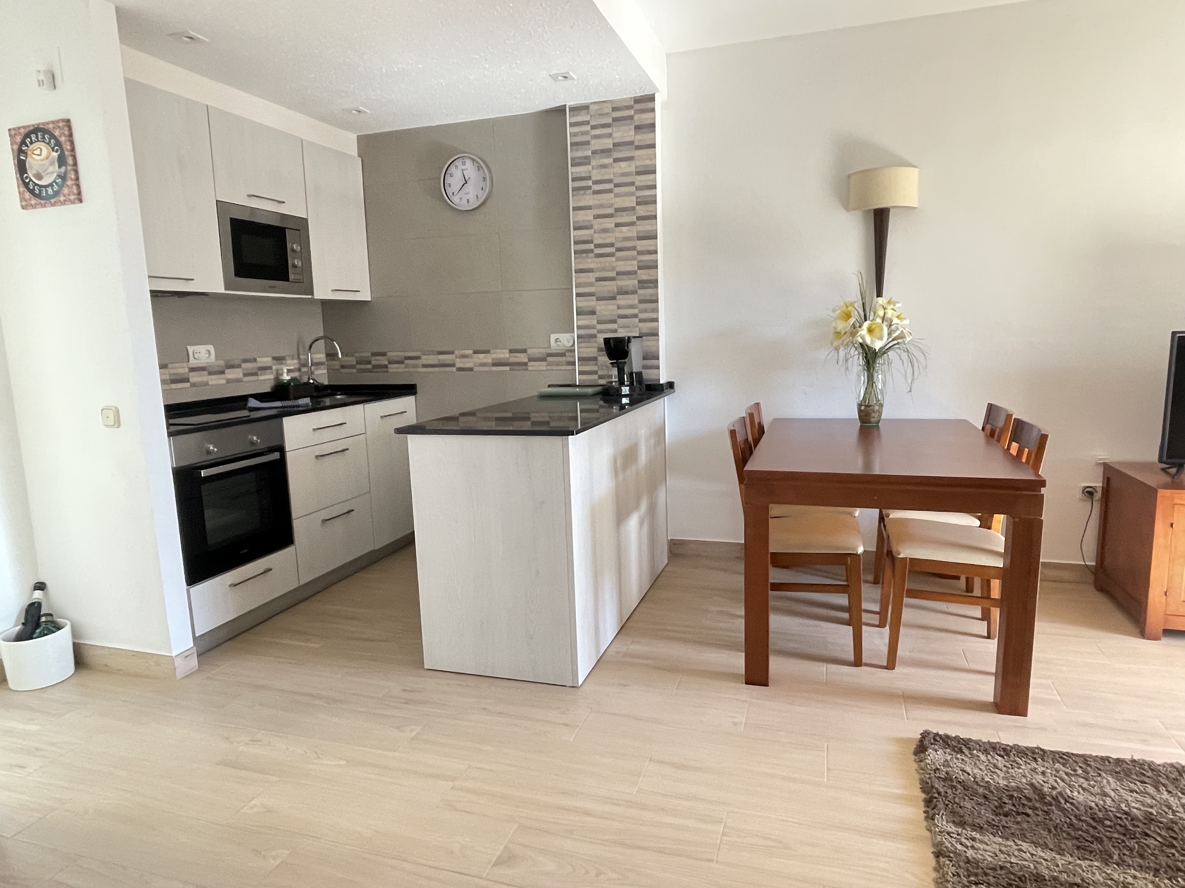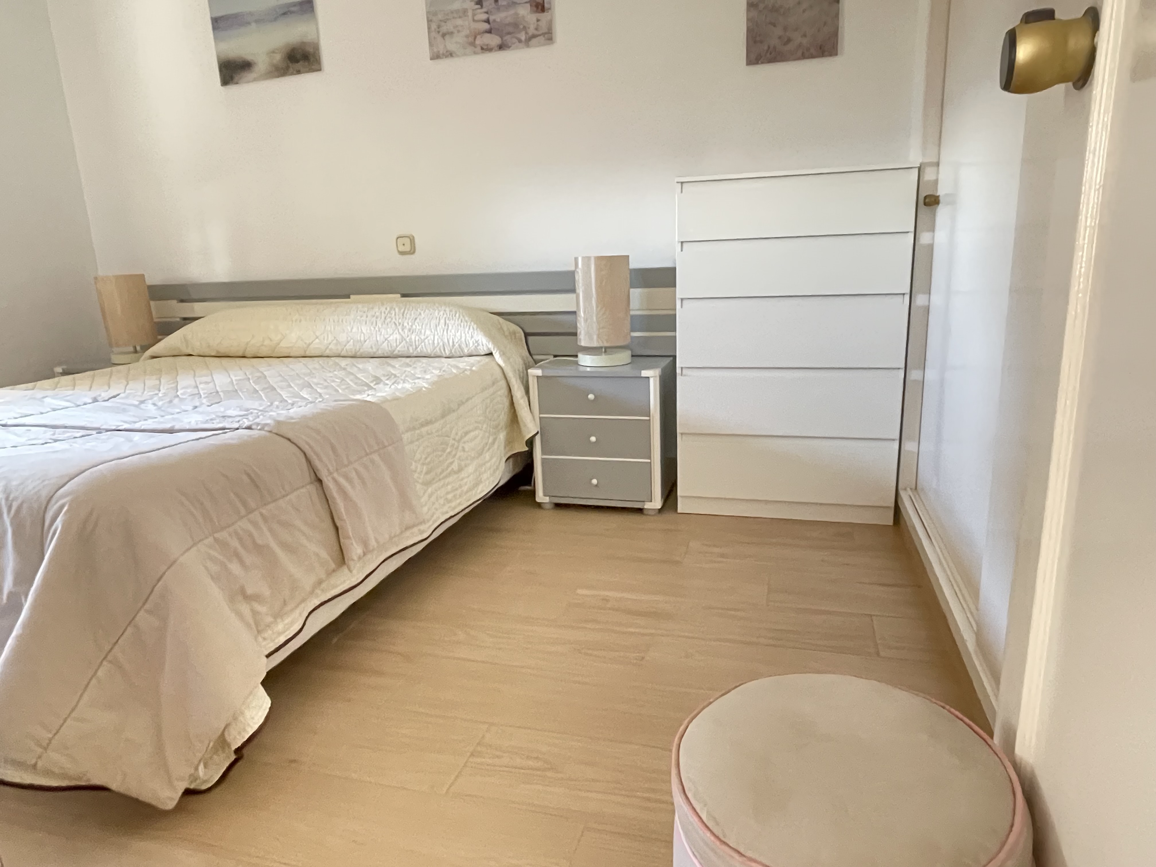 Amplio piso con aire acondicionado en salón y TV de 42"; salón comedor con dos sofás uno de ellos cama, cocina reformada con barra americana totalmente equipada, nevera grande, vitrocerámica de dos fuegos y horno.