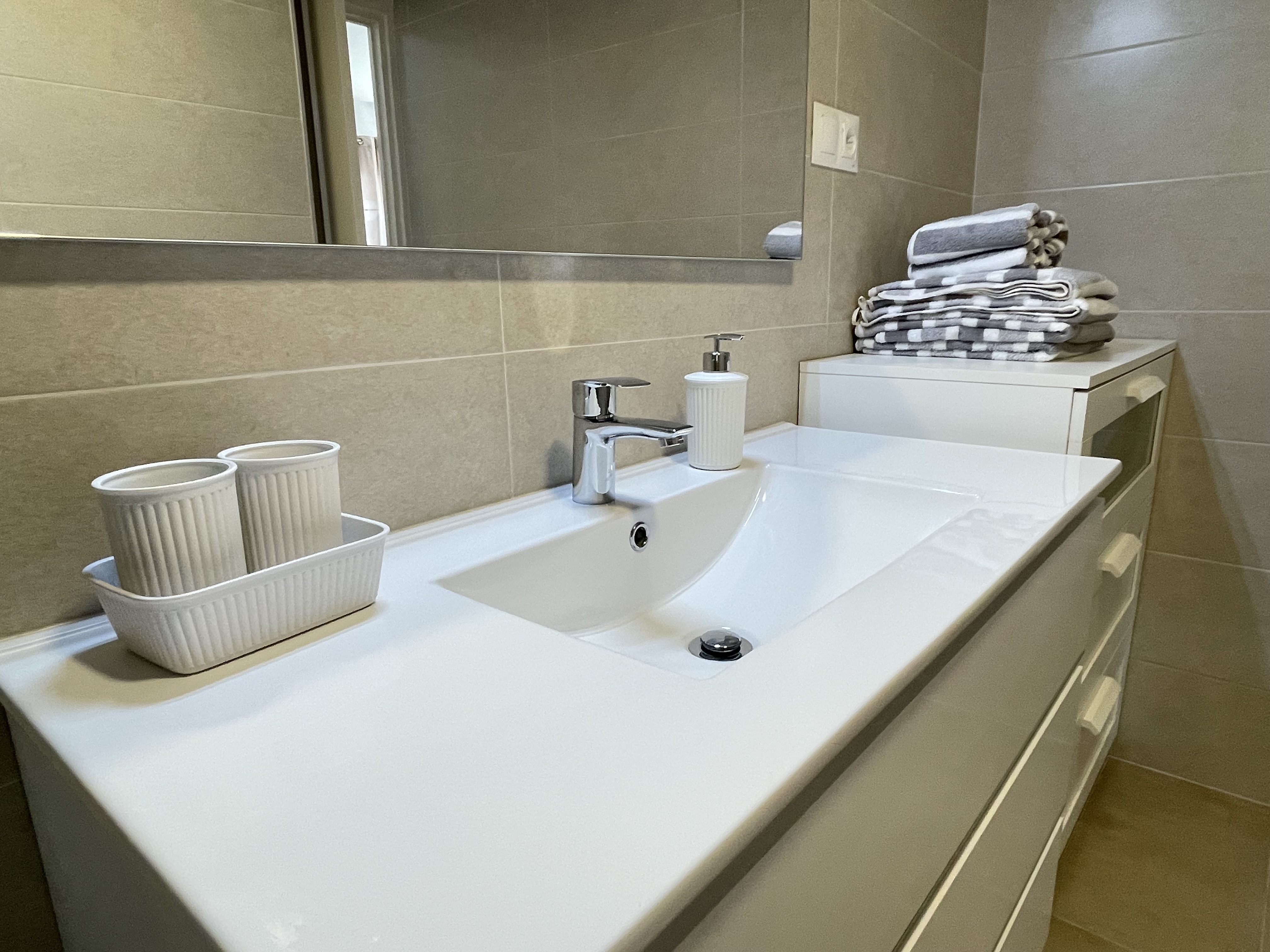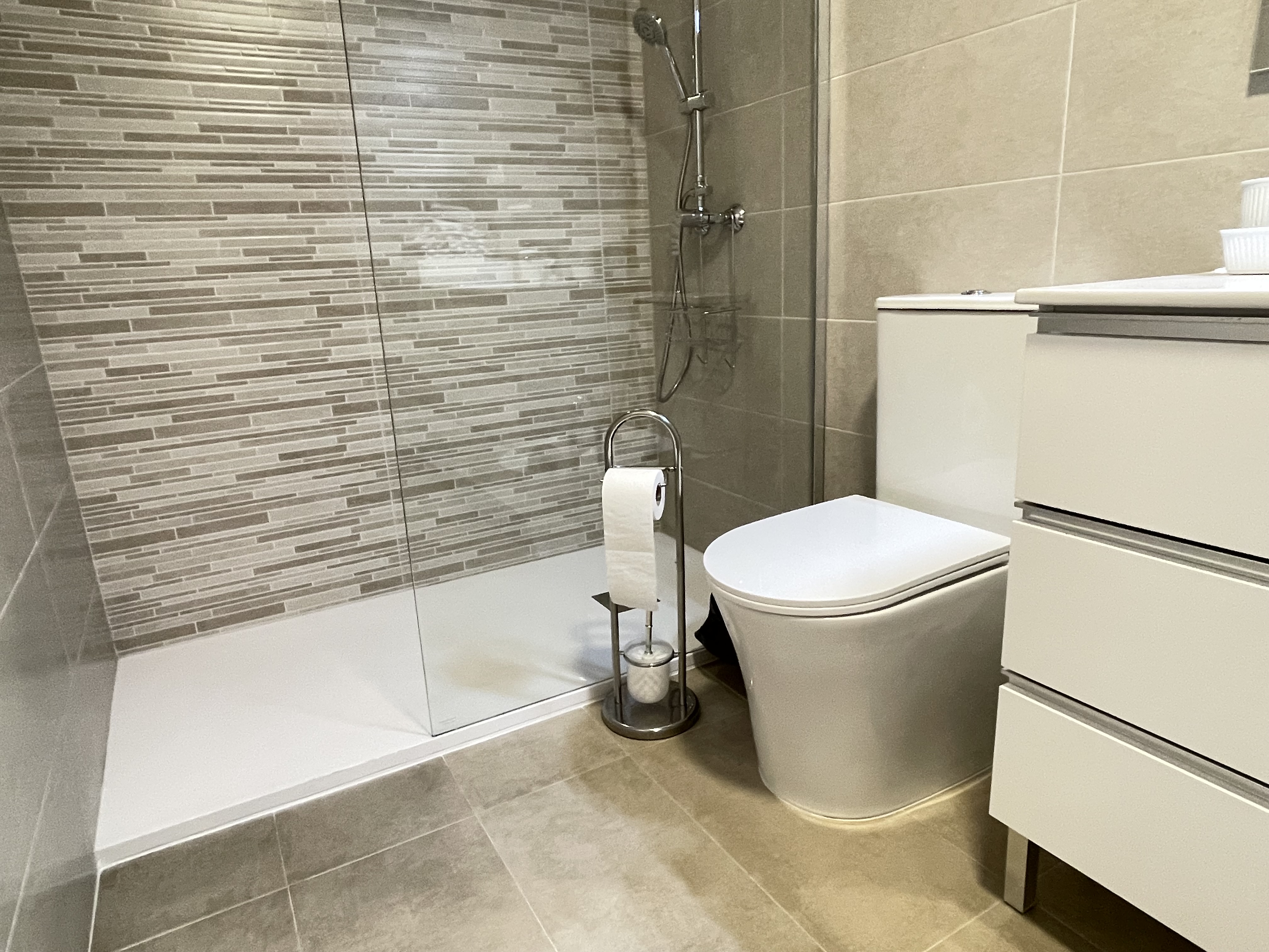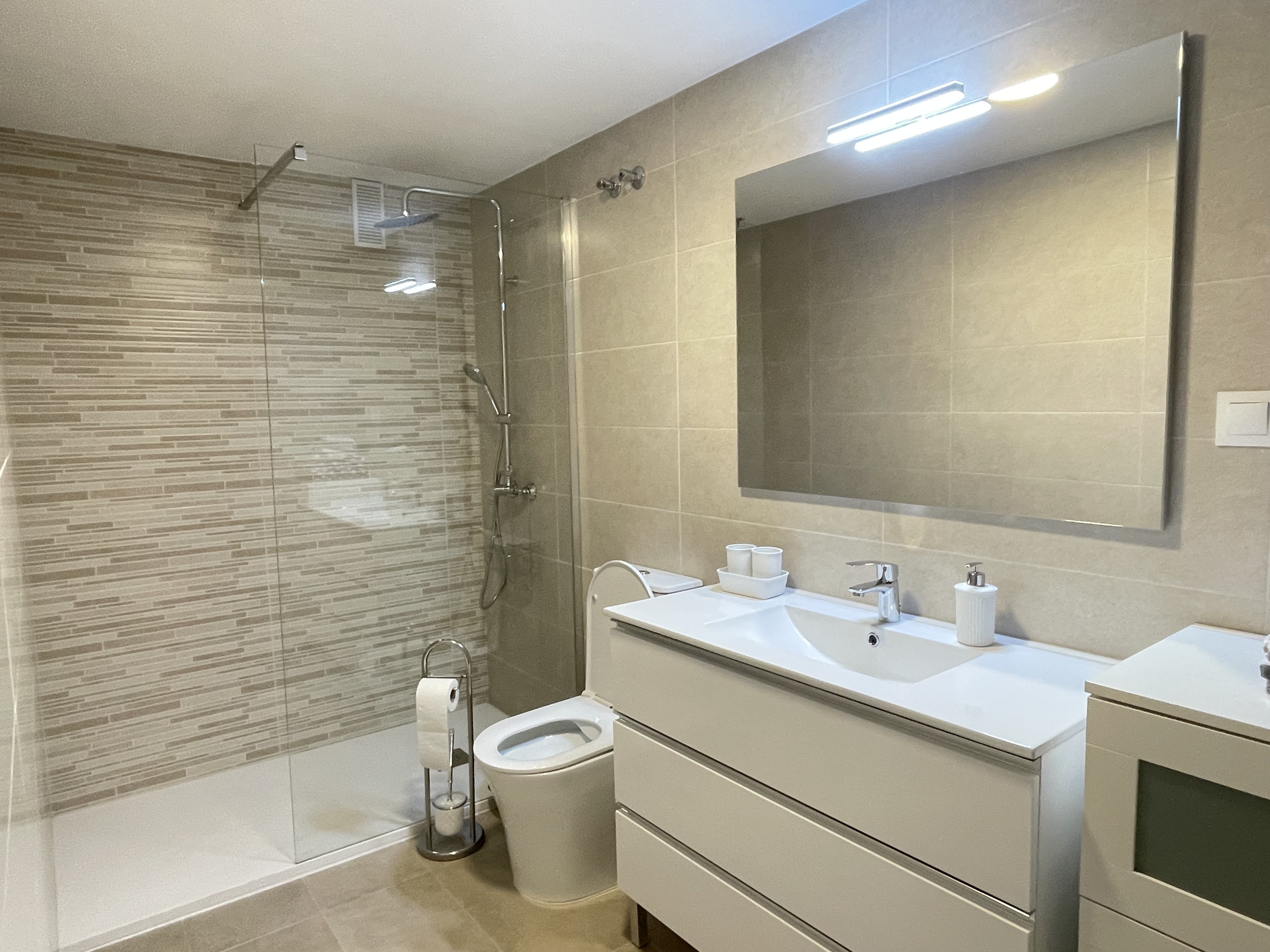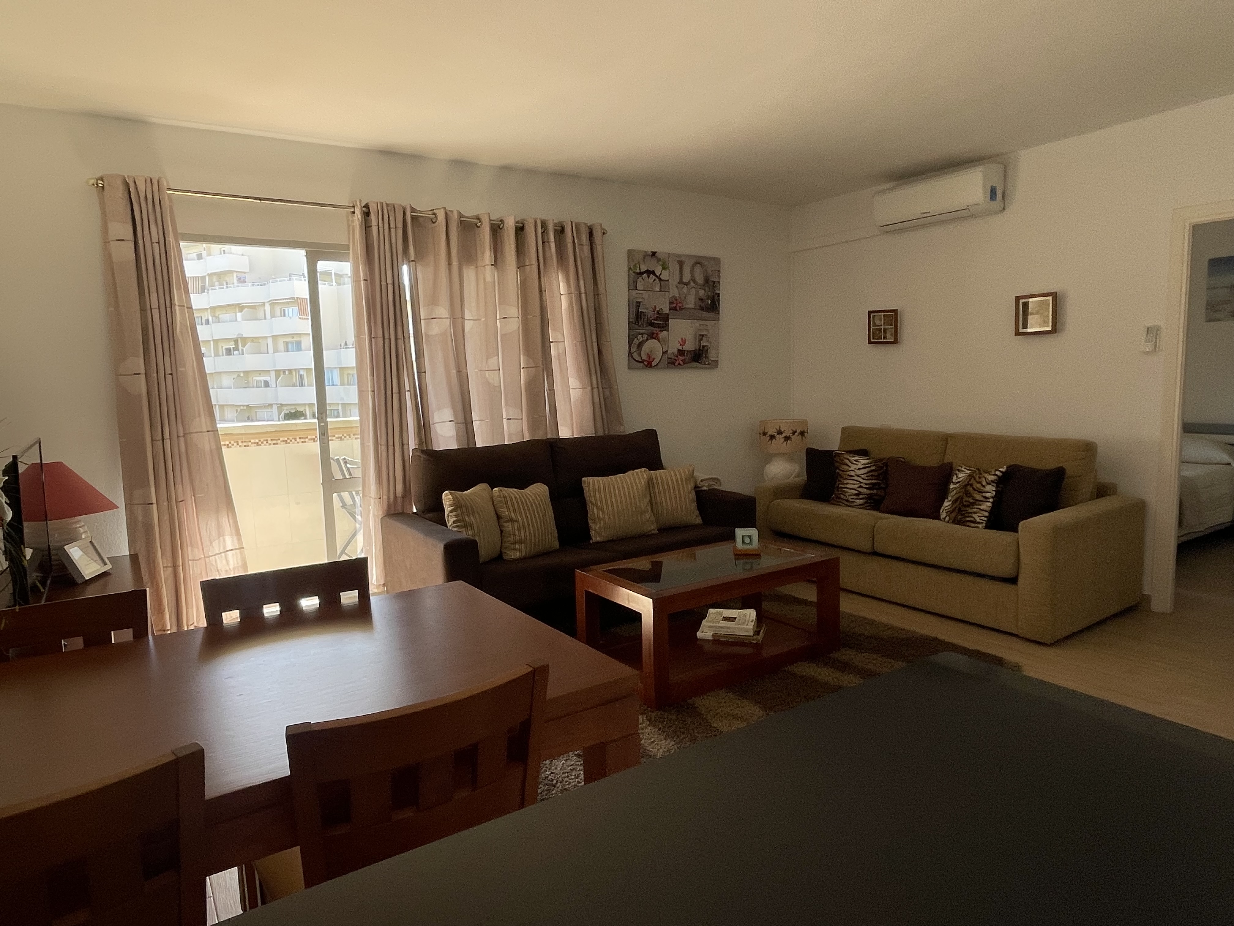 Amplio piso con aire acondicionado en salón y TV de 42"; salón comedor con dos sofás uno de ellos cama, cocina reformada con barra americana totalmente equipada, nevera grande, vitrocerámica de dos fuegos y horno.