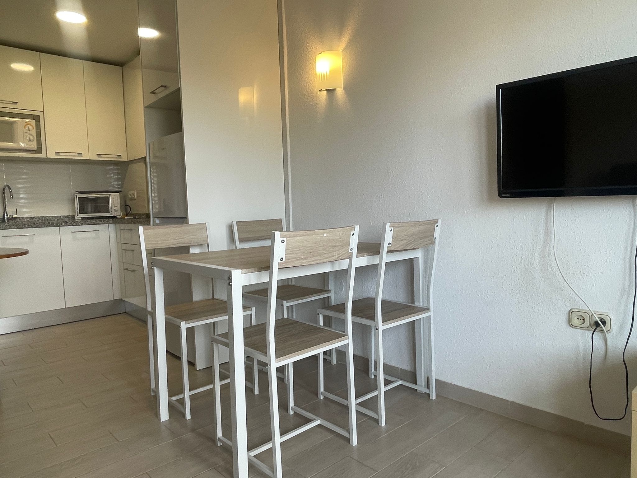Fully renovated kitchen with four-ring hob, large refrigerator, microwave and washing machine.