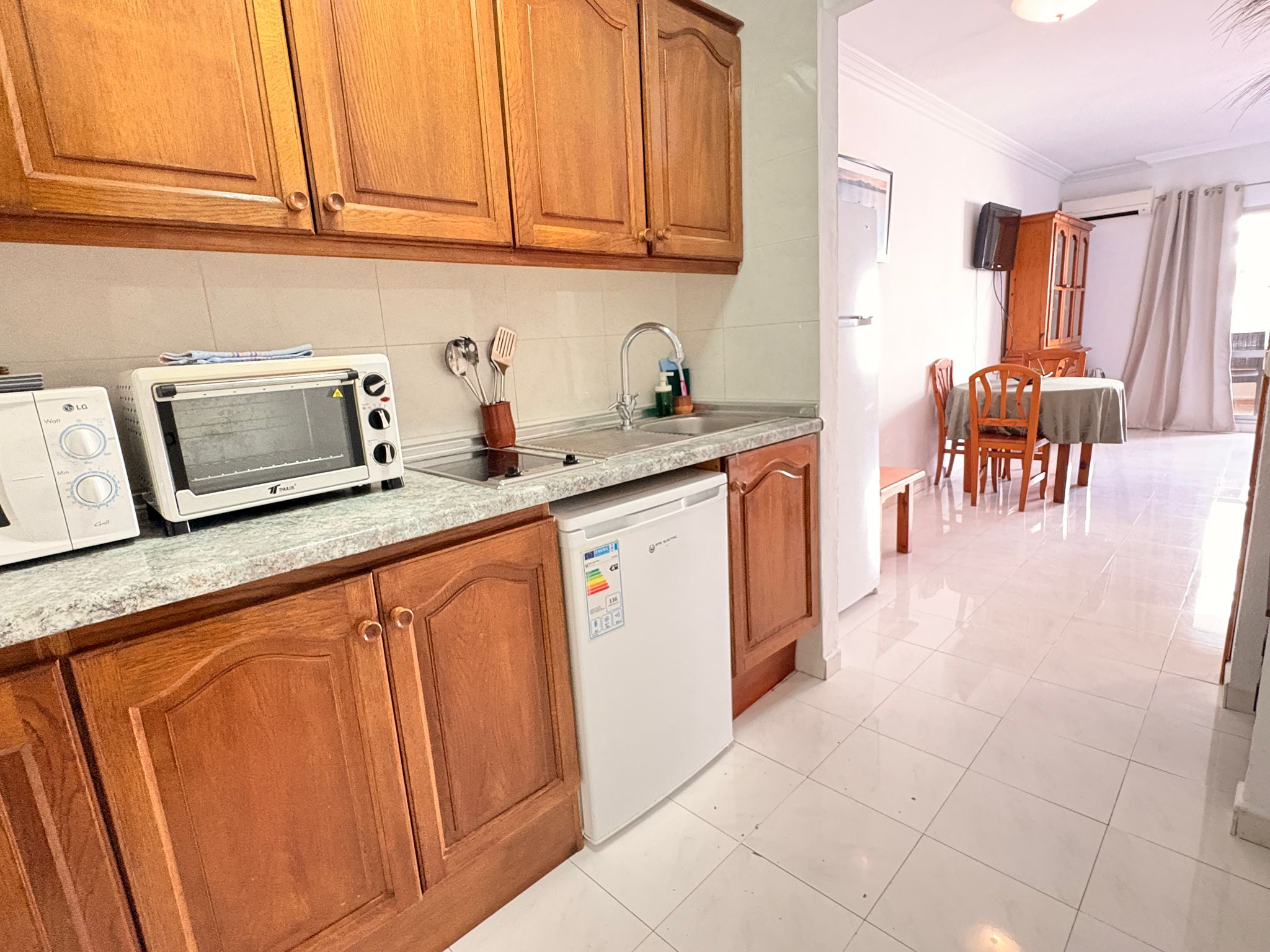 Cocina con vitrocerámica de dos fuegos, nevera grande y microondas, lavadora.