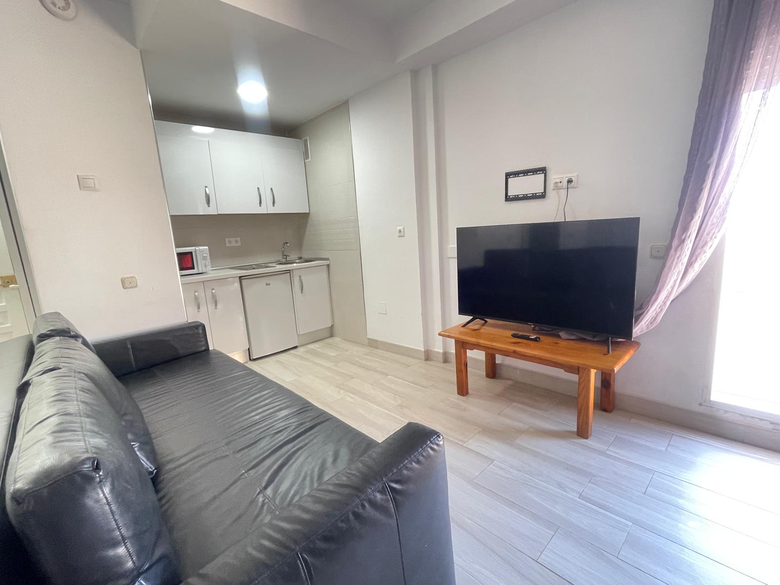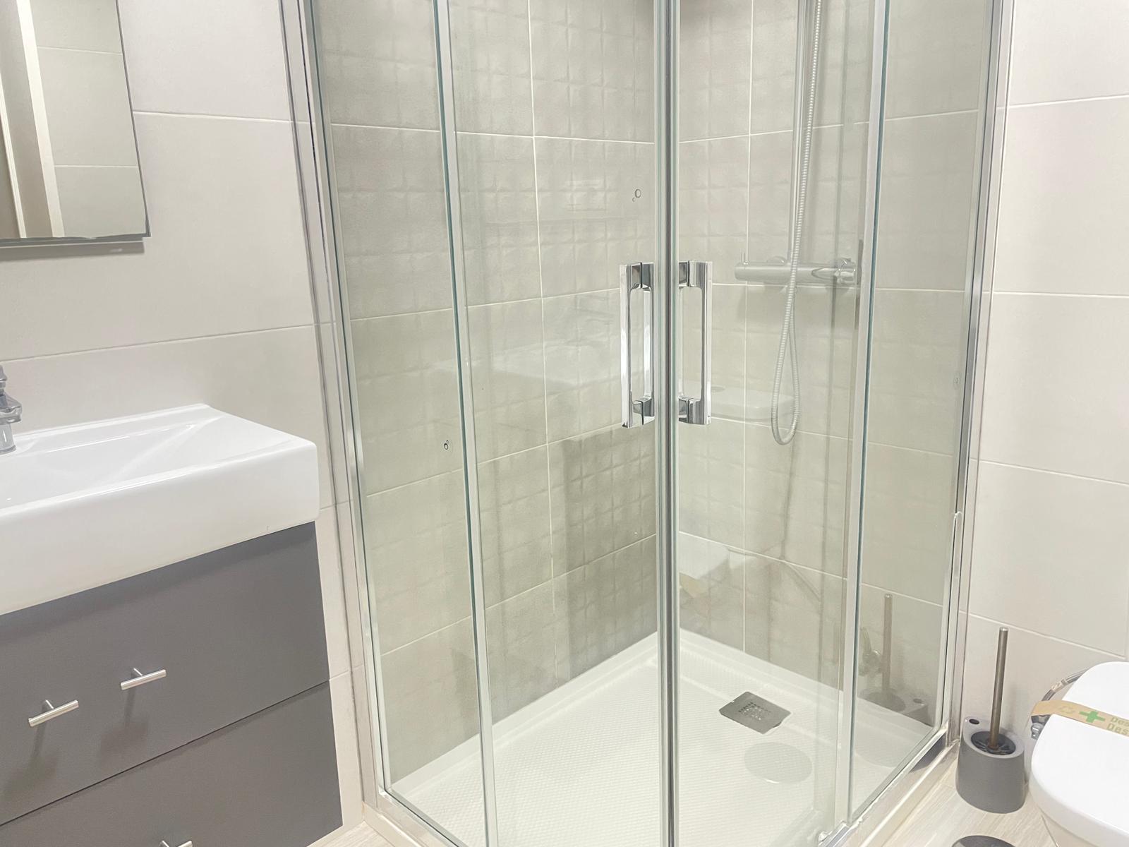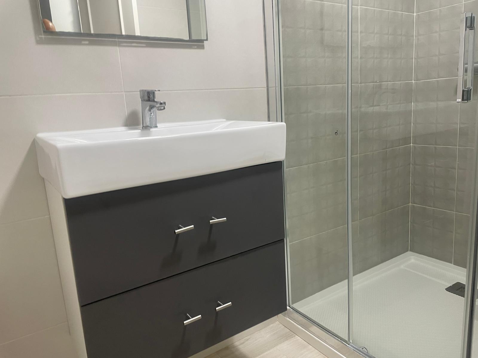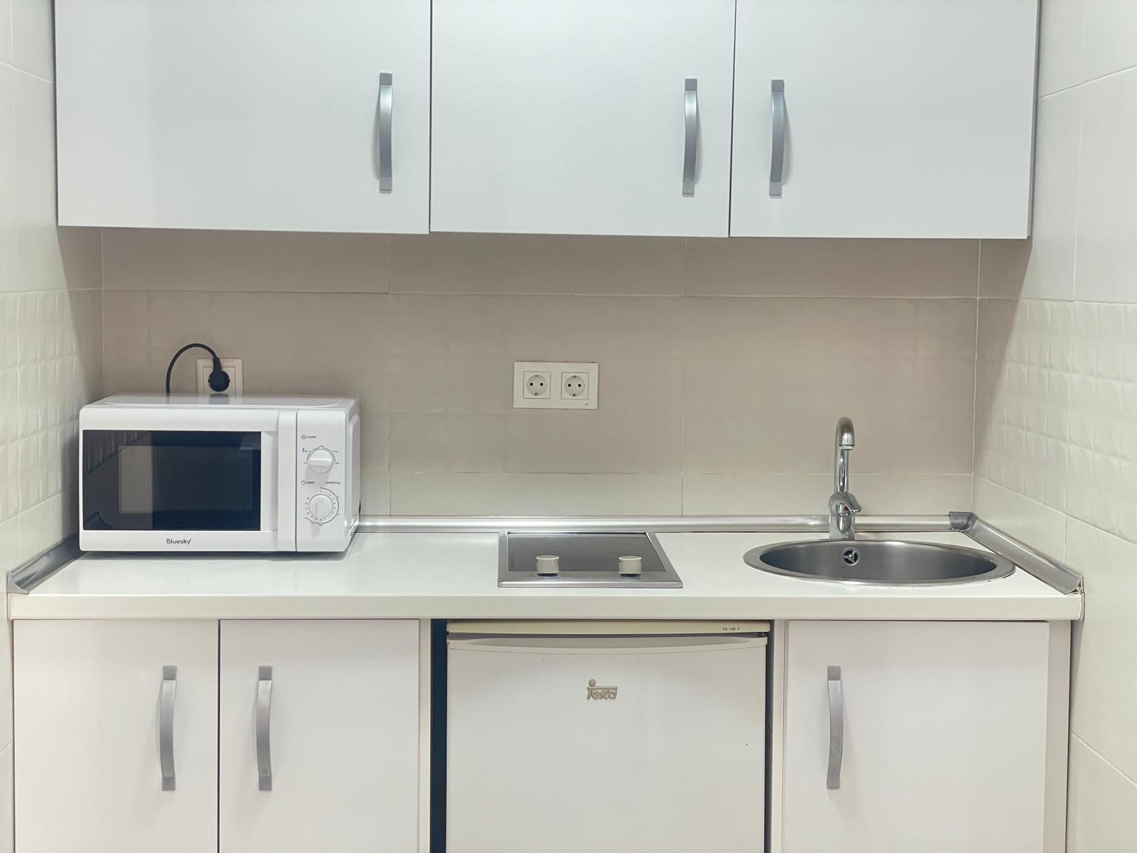 A fully equipped kitchen includes a refrigerator, two-burner ceramic hob, and a washing machine.
